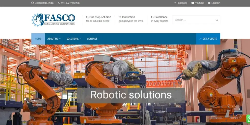 FASCO Pvt Ltd is a multinational company operating in Coimbatore and Singapore and is one of the leading automation companies in Coimbatore offering turnkey automation solutions in industries. Their specialization is in robots, special purpose machines, and automotive, FMCG, textile, and defense material handling systems, with more than 100 successful projects delivered.