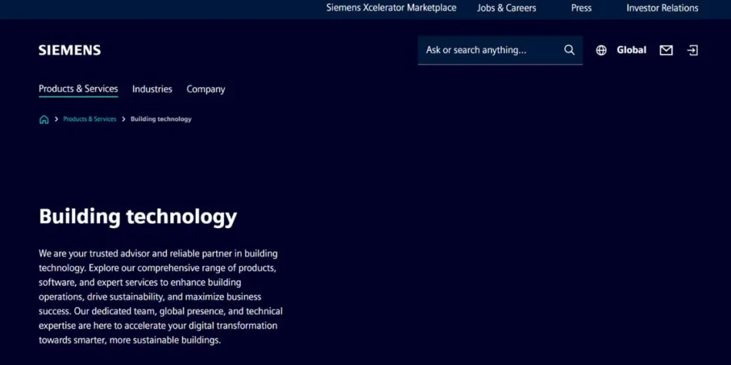 Siemens Building TechnologiesBuilding automation, HVAC control, Energy managementGlobal technology, Integrated solutionsBuilding and infrastructure automation